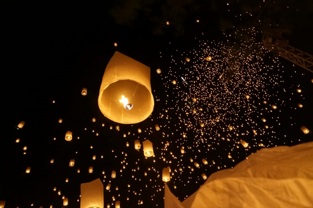 ロイクラトン祭りとはタイの伝統的なお祭りで、収穫や水の精霊に感謝の祈りをささげ、心の罪などを洗い流すという意味で川に灯籠を流すものです。